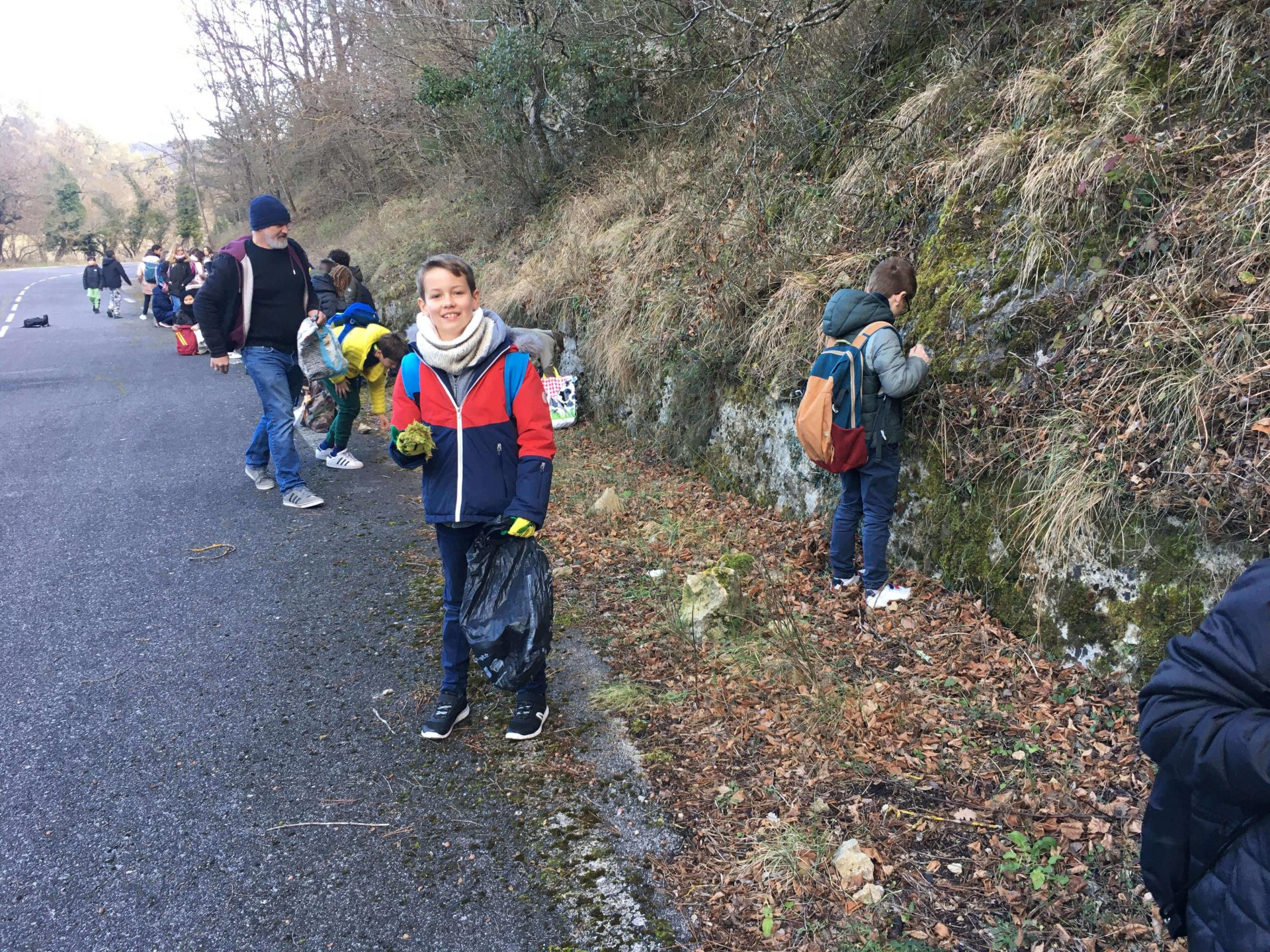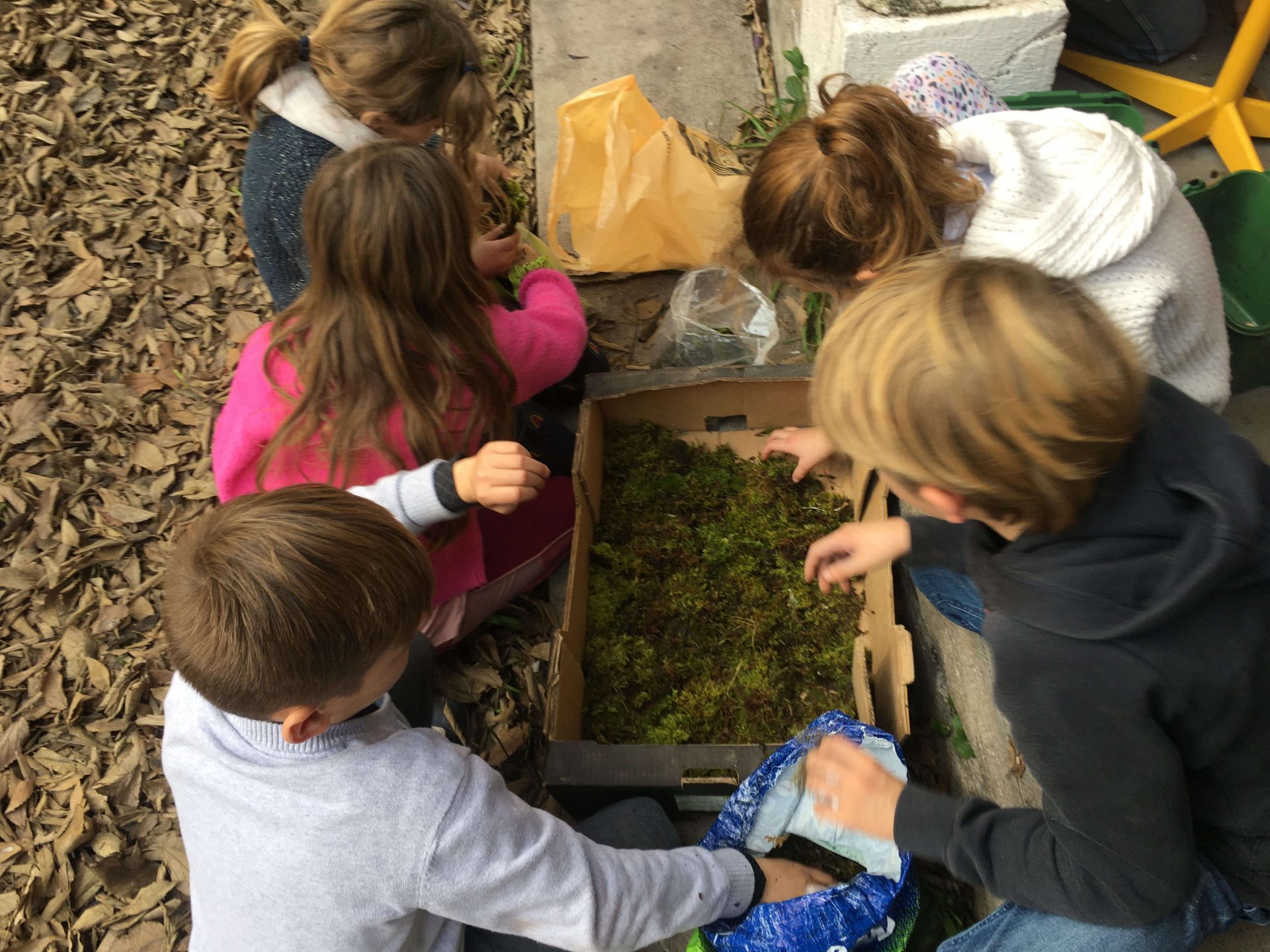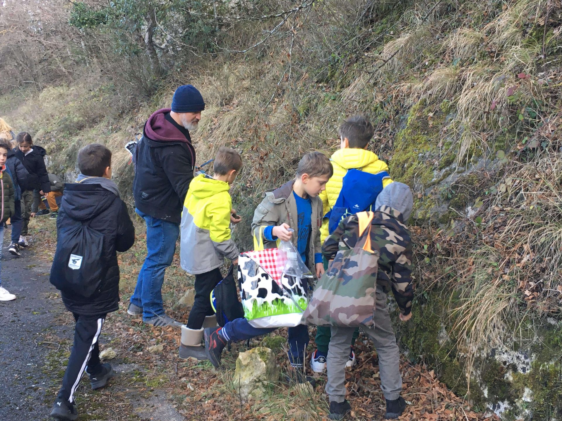 Récolte de la mousse avec M Harold MAKA à Chateaudouble pour le projet de fresque végétale, avec les CM1