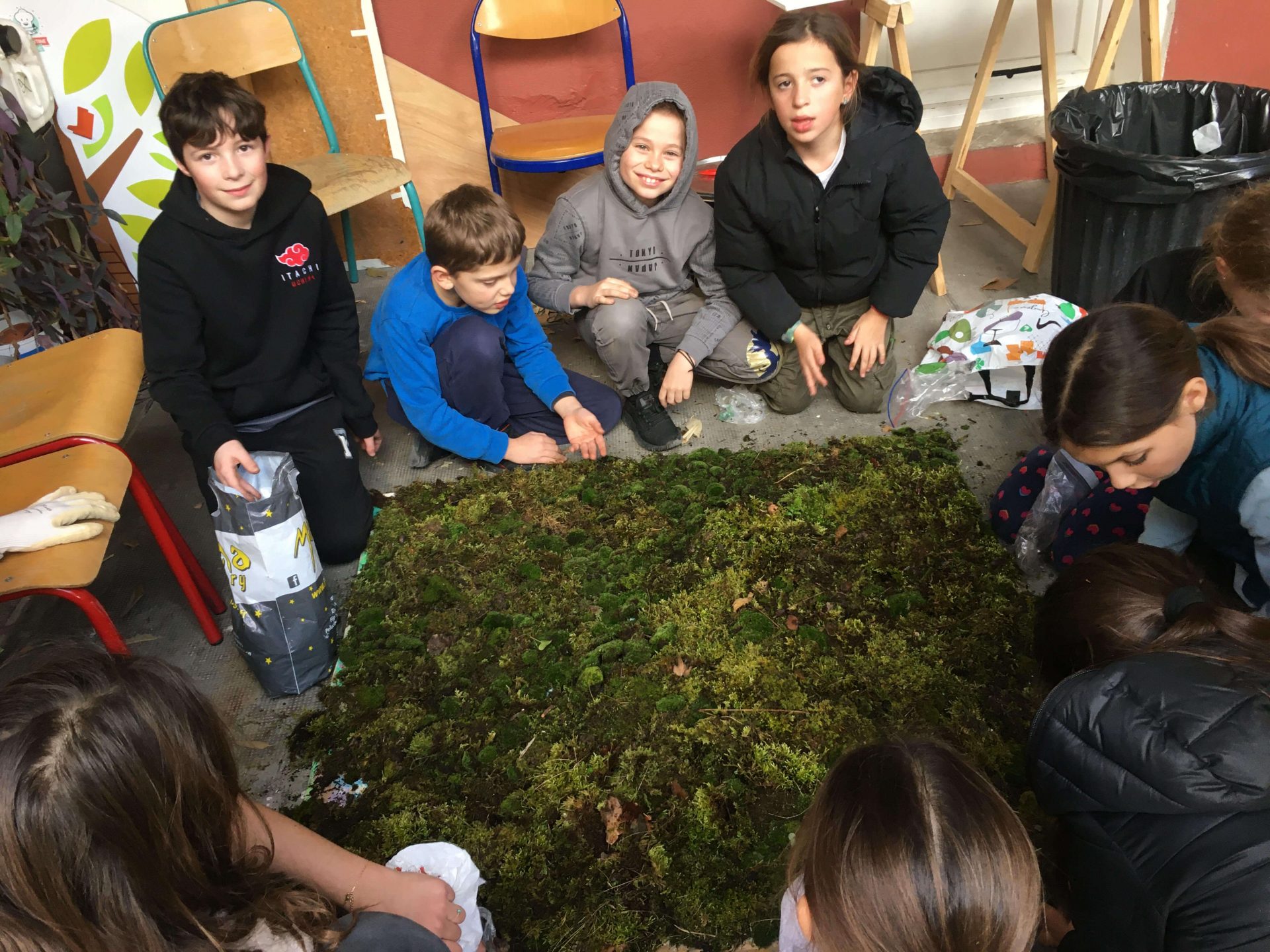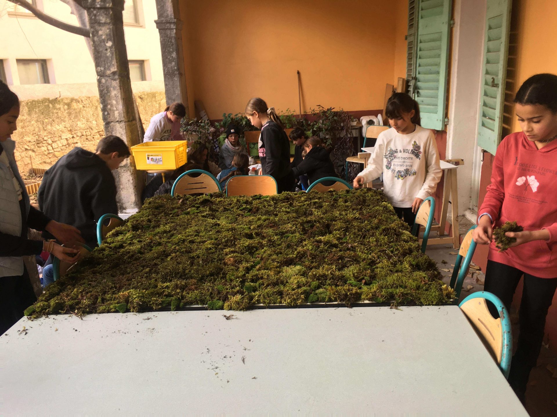 Récolte de la mousse avec M Harold MAKA à Chateaudouble pour le projet de fresque végétale, avec les CM2